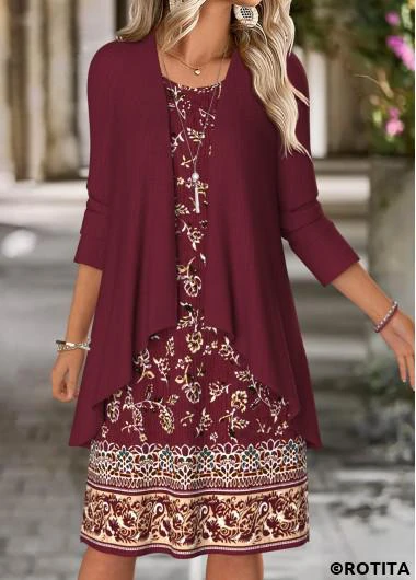 Home > Dresses/ ROTITA Tummy Coverage Floral Print Wine Red Dress and Cardigan