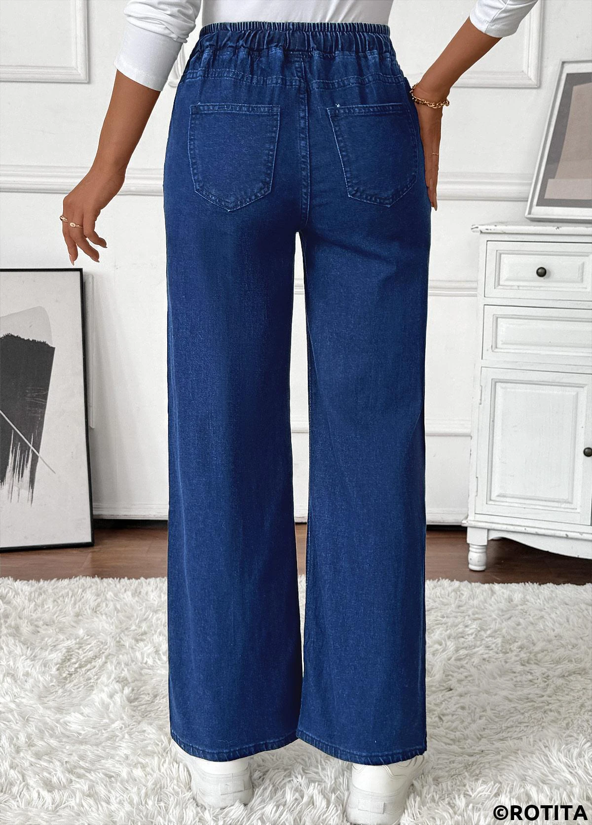 Pocket Denim Blue Wide Leg Elastic Waist Jeans