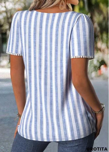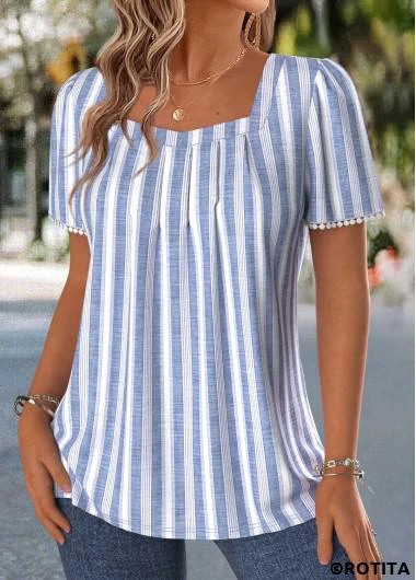 Home > Plus Size > Plus Size Tops/ ROTITA Plus Size Pleated Blue Striped Square Neck T Shirt