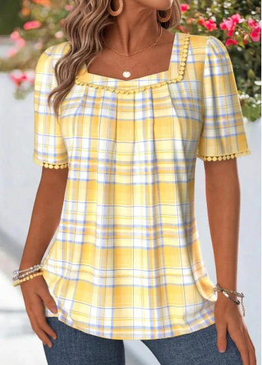 Home > Tops > Tees&T-shirts/ ROTITA Pleated Plaid Yellow Square Neck Short Sleeve T Shirt