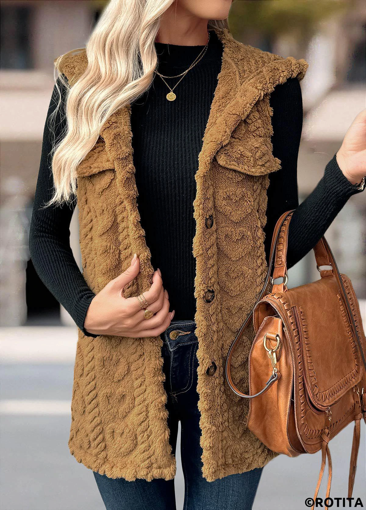 Button Dark Camel Hooded Sleeveless Waistcoat