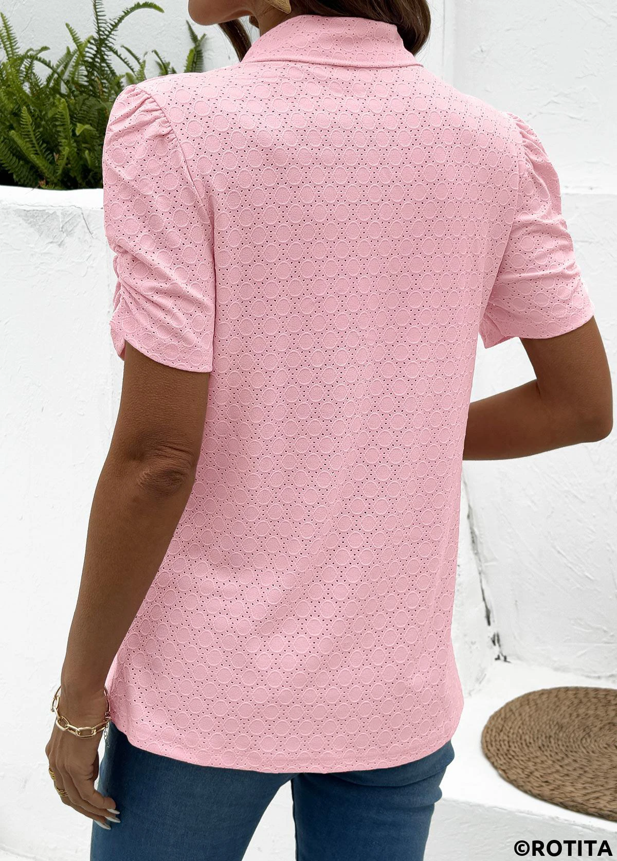 Neu in Rotita-Bluse mit Bauchbedeckung rosa Kurzarmbluse mit Umlegekragen.