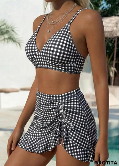 Heim > Bademode > Bikinis > Bikini-Sets/ Rotita Bikini-Set schwarz mit geschwungenem Saum Vichy-Karo-Muster mittelhoch geschnitten
