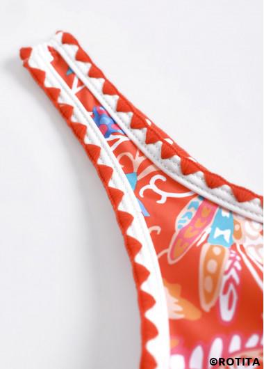 ein schicker korallenroter einteiliger Badeanzug mit lebendigem Pflanzendruck. Er verfügt über ein Knotendetail an der Unterseite und ein asymmetrisches Design. Der Badeanzug hat herausnehmbare Polster und verstellbare Schultergurte für eine perfekte Passform. Seine figurbetonte Silhouette betont die Kurven und macht ihn ideal für den Strandurlaub.