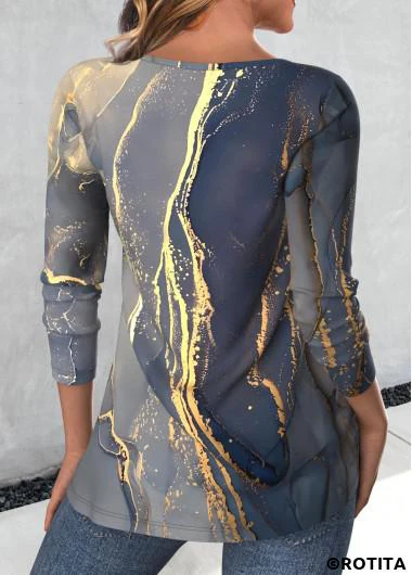 Heim > Oberteile > T-Shirts/ Blaues Rundhals-T-Shirt mit Rotita-Knopf und Marmor-Print
