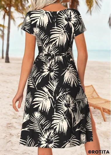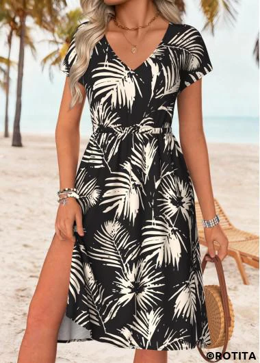 Heim > Kleider/ schwarzes Kleid mit Blattmuster und V-Ausschnitt das den Bauch bedeckt