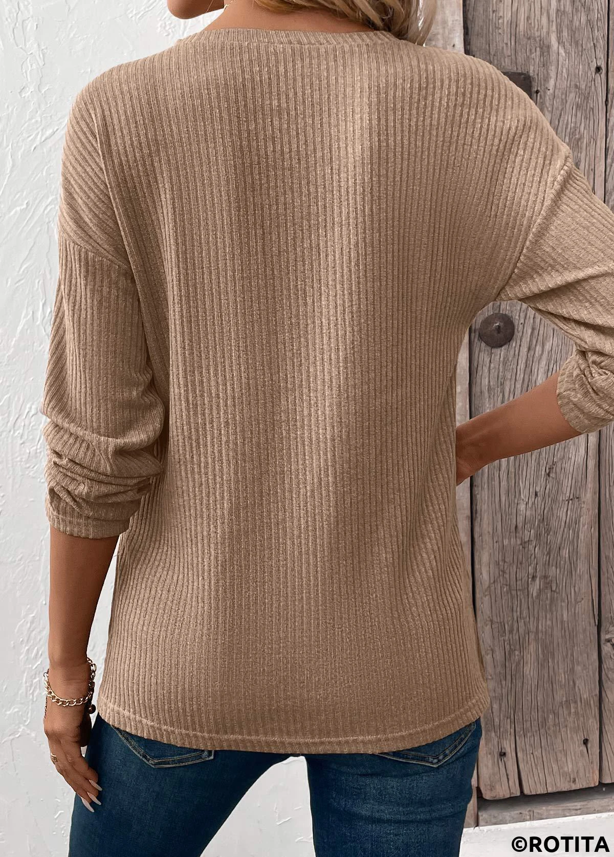 Heim > Oberteile > T-Shirts/ Rotita T-Shirt mit Bauchbedeckung in hellem Kaffeebraun und Rundhalsausschnitt