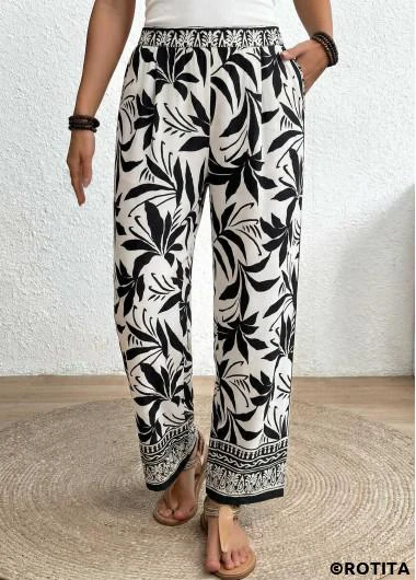 Heim > Unterteile > Hose/ Rotita schwarze Hose mit weichem Tropenpflanzenmuster und weitem Bein