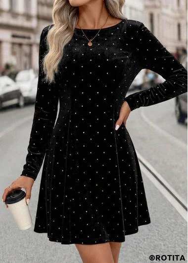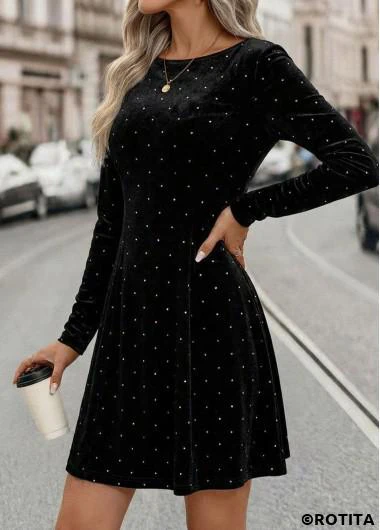 Heim > Kleider/ Rotita – Schwarzes kurzes langärmliges Kleid mit Bauchbedeckung und U-Boot-Ausschnitt