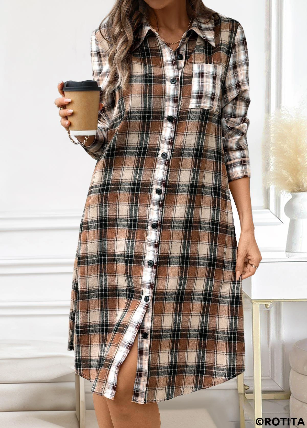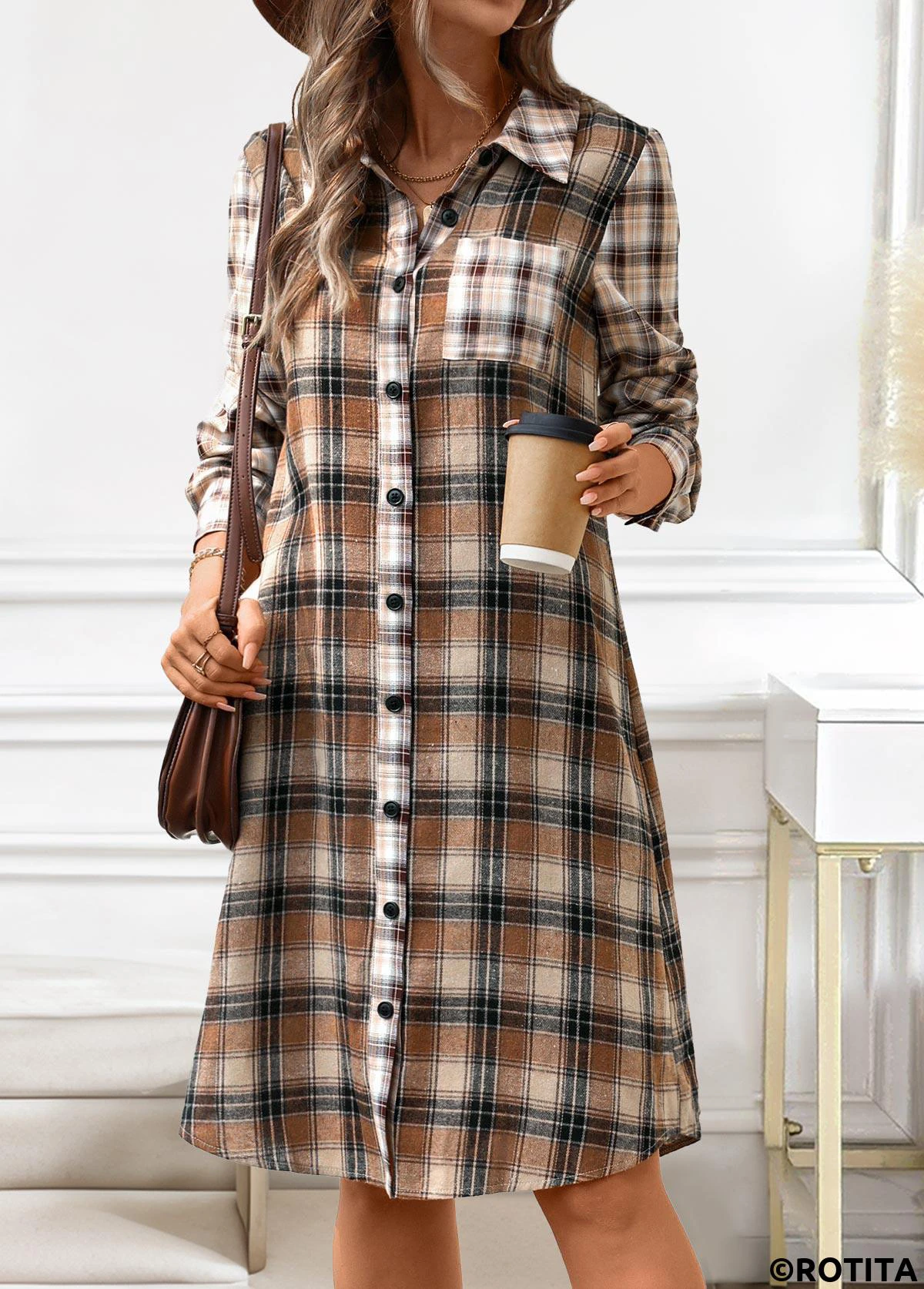 Heim > Kleider/ Rotita-Knopf-Plaid-Kleid in Dunkelkaffee mit A-Linien-Hemdkragen