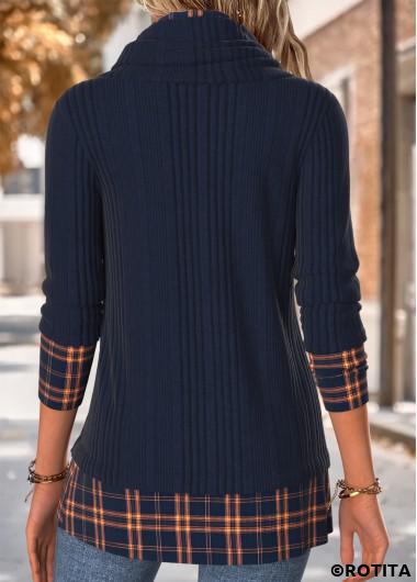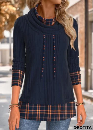 Neu in Rotita – Bauchbedeckendes kariertes marineblaues Sweatshirt mit Wasserfallausschnitt und langen Ärmeln