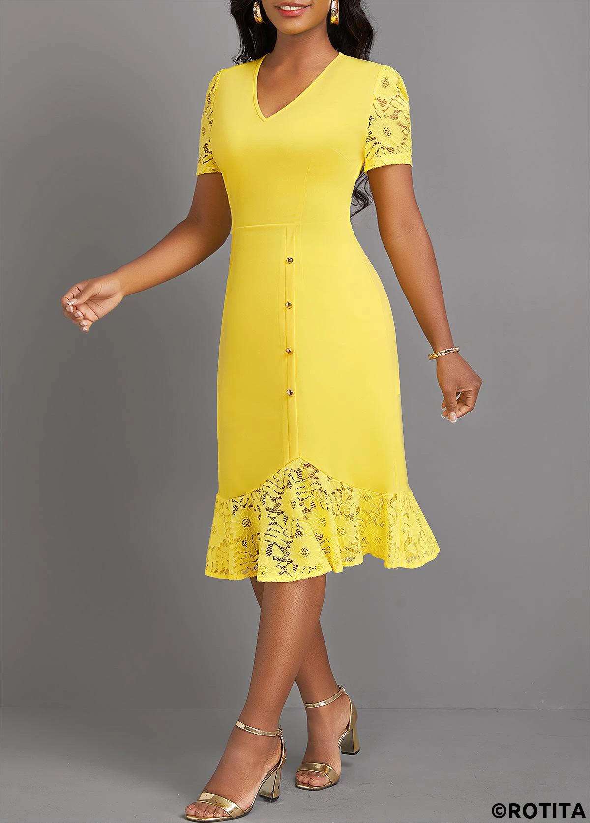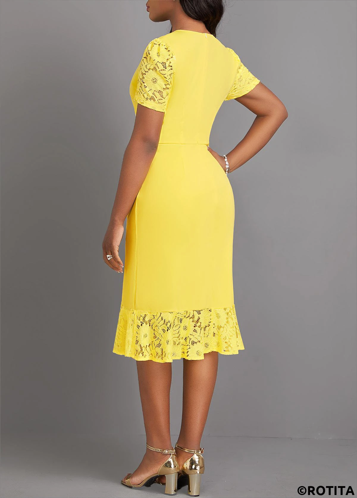 Verkauf Rotita-Spitzenkleid in Hellgelb mit V-Ausschnitt und kurzen Ärmeln
