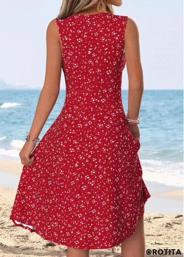 rotita rotes gepunktetes gerafftes ärmelloses Kleid mit Rundhalsausschnitt