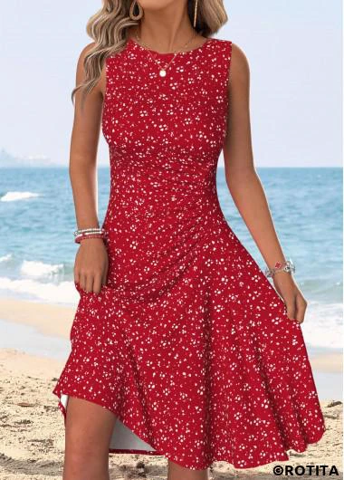 Heim > Kleider/ rotita rotes gepunktetes gerafftes ärmelloses Kleid mit Rundhalsausschnitt