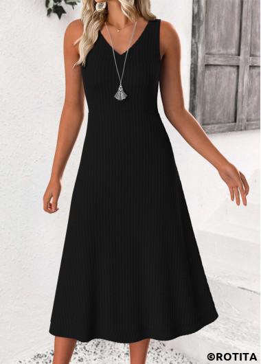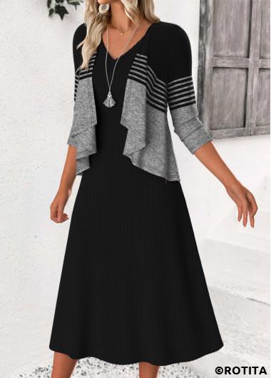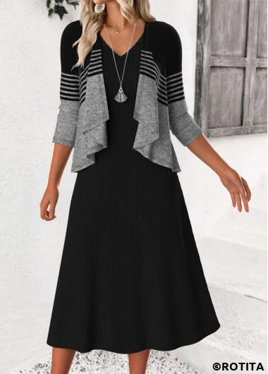 Neu in Rotita – Bauchbedeckendes gestreiftes schwarzes Kleid mit V-Ausschnitt und Strickjacke