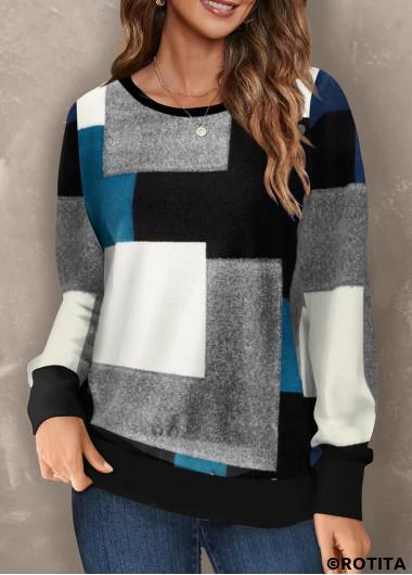 Heim > Übergröße > Plus-Size-Tops/ Schwarzgrünes Rotita-Sweatshirt mit Rundhalsausschnitt und geometrischem Aufdruck in Übergröße