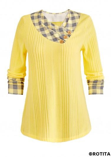 Heim > Oberteile > T-Shirts/ Hellgelbes Rotita-Patchwork-Karo-T-Shirt mit V-Ausschnitt