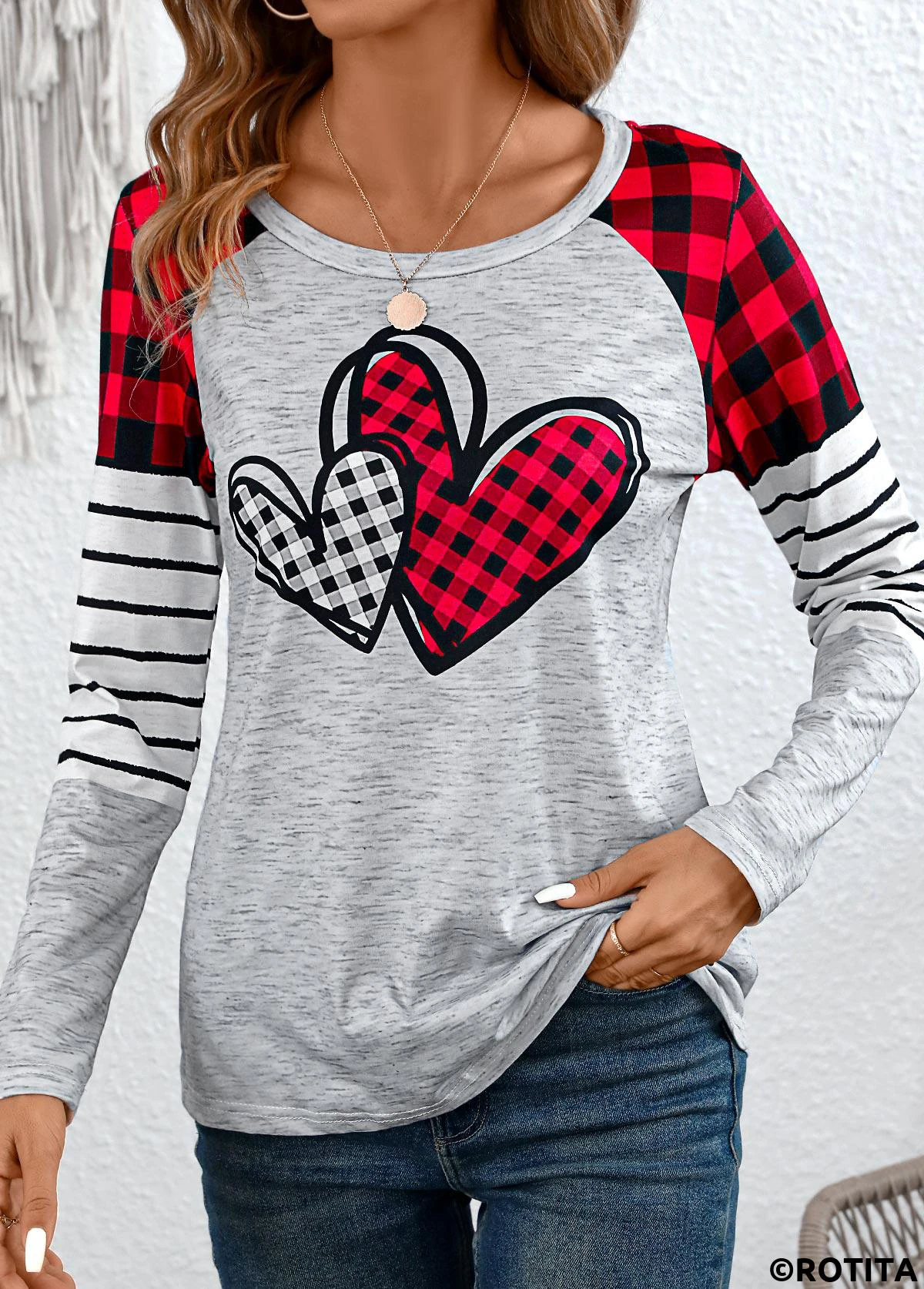 Heim > Oberteile > T-Shirts/ Rotita Patchwork-Karo-T-Shirt in Grau mit Rundhalsausschnitt und langen Ärmeln