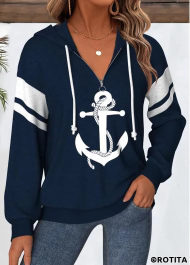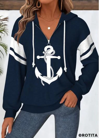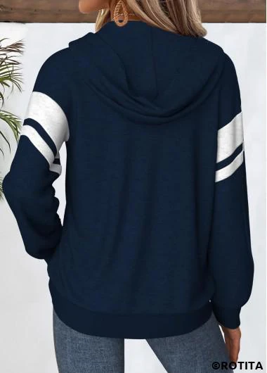 Heim > Oberteile > Sweatshirts & Hoodies/ Rotita – Bauchbedeckung – Marineblauer langärmliger Kapuzenpullover mit geometrischem Print