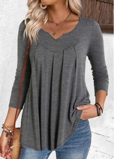 Heim > Oberteile > T-Shirts/ Rotita plissiertes graues Langarmshirt mit V-Ausschnitt