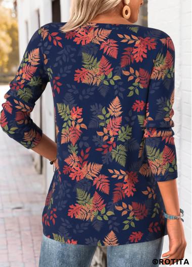 Heim > Übergröße > Plus-Size-Tops/ Rotita – T-Shirt in Übergröße mit Bauchbedeckung in Marineblau mit Blattmuster