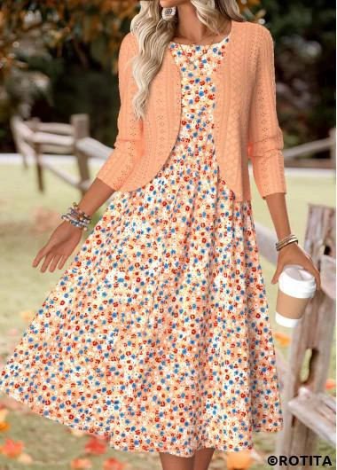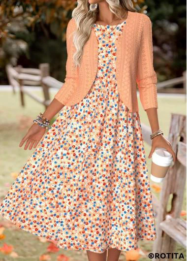 Heim > Kleider/ Rotita – Orangefarbenes Kleid und Cardigan mit Rundhalsausschnitt und kleinem Blumenmuster