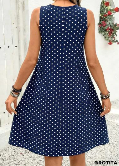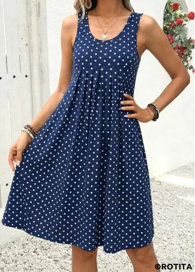 Heim > Kleider/ Rotita marineblaues gepunktetes plissiertes A-Linien-Kleid mit Rundhalsausschnitt