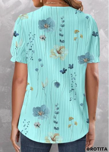 Verkauf Rotita – Patchwork-Blumendruck – Cyan-Kurzarmbluse mit V-Ausschnitt