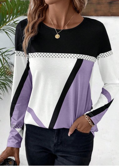 Heim > Oberteile > T-Shirts/ Hellviolettes Rotita-Patchwork-T-Shirt mit geometrischem Aufdruck und Rundhalsausschnitt