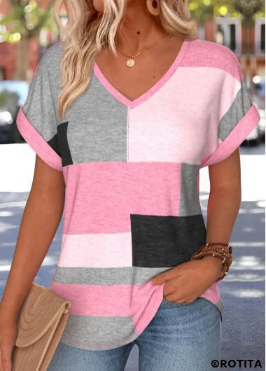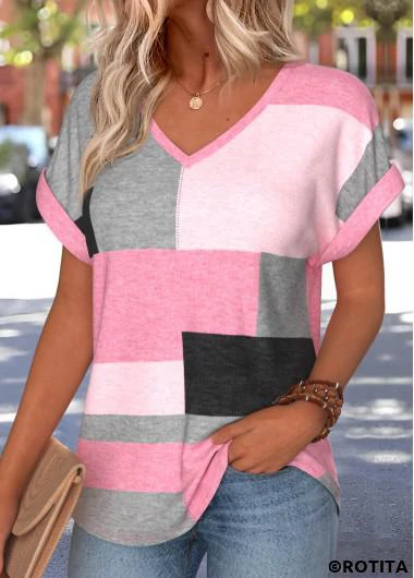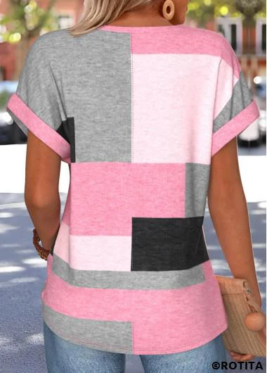Heim > Oberteile > T-Shirts/ Rotita Bauchbedeckung geometrischer Print rosa V-Ausschnitt T-Shirt