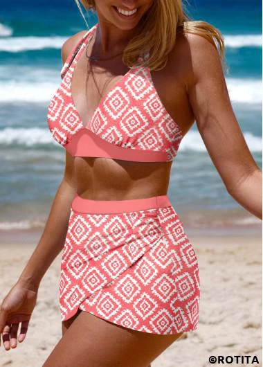 Heim > Bademode > Bikinis > Bikini-Sets/ Rotita-Bikini-Set mit überkreuztem Saum in Korallenrot und geometrischem Muster