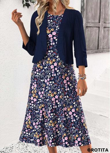Heim > Kleider/ Rotita-Kleid und Strickjacke mit Blättermuster und Bauchbedeckung in Marineblau