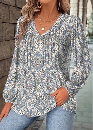 Heim > Oberteile > Blusen/ Bluse mit V-Ausschnitt und Ethno-Print in Staubblau die den Bauch bedeckt