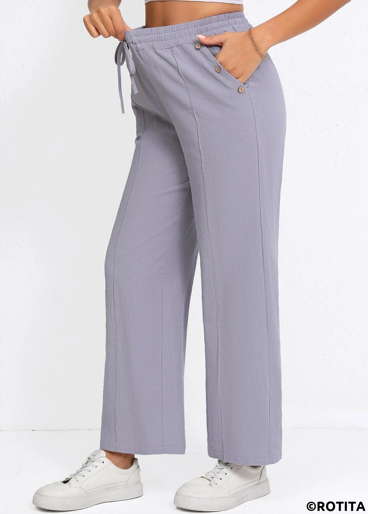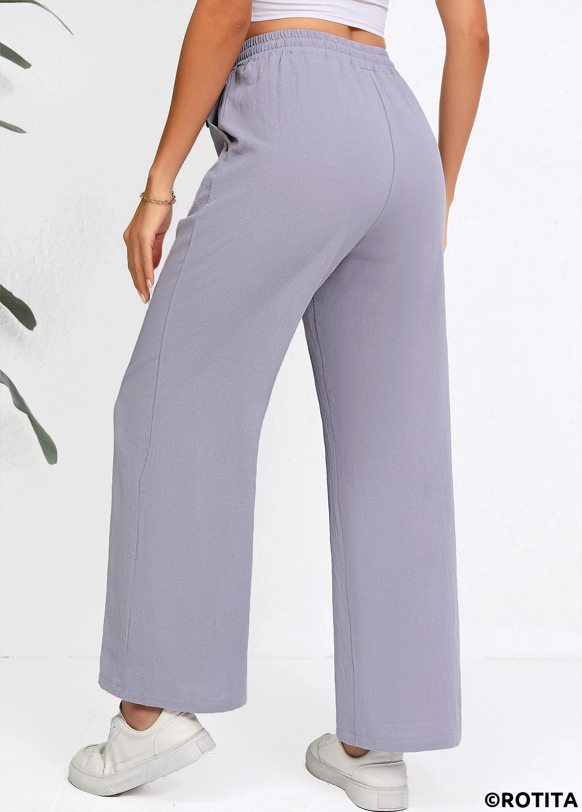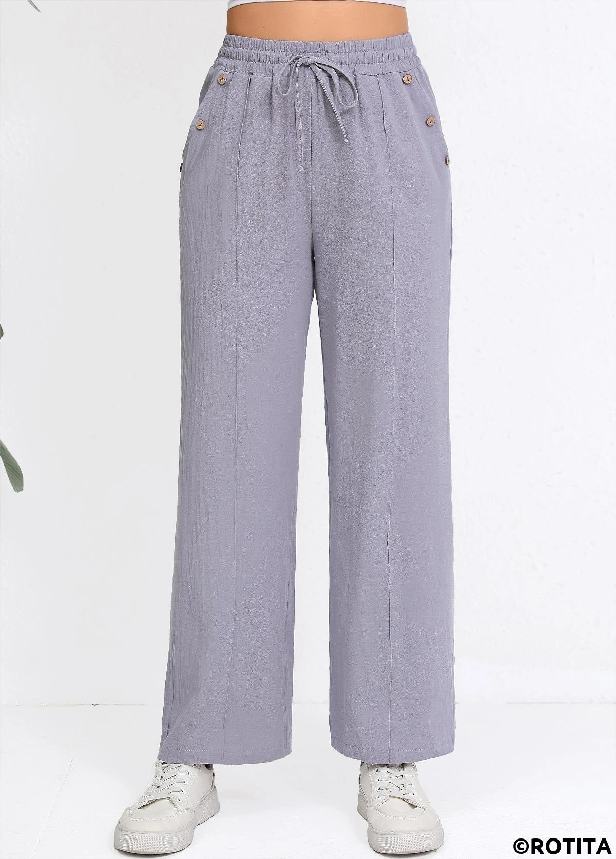 Sale Drawstring Grey Straight Leg Elastic Waist High Waisted Pants