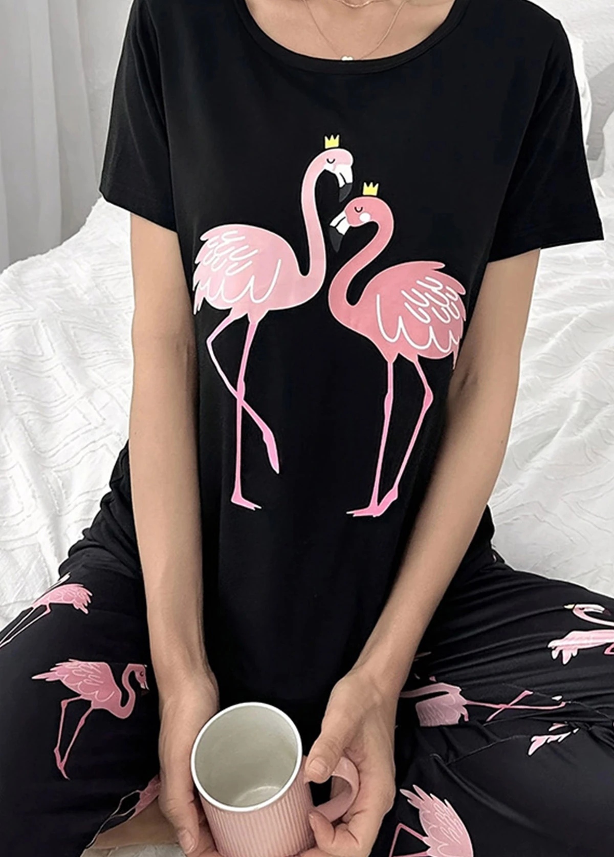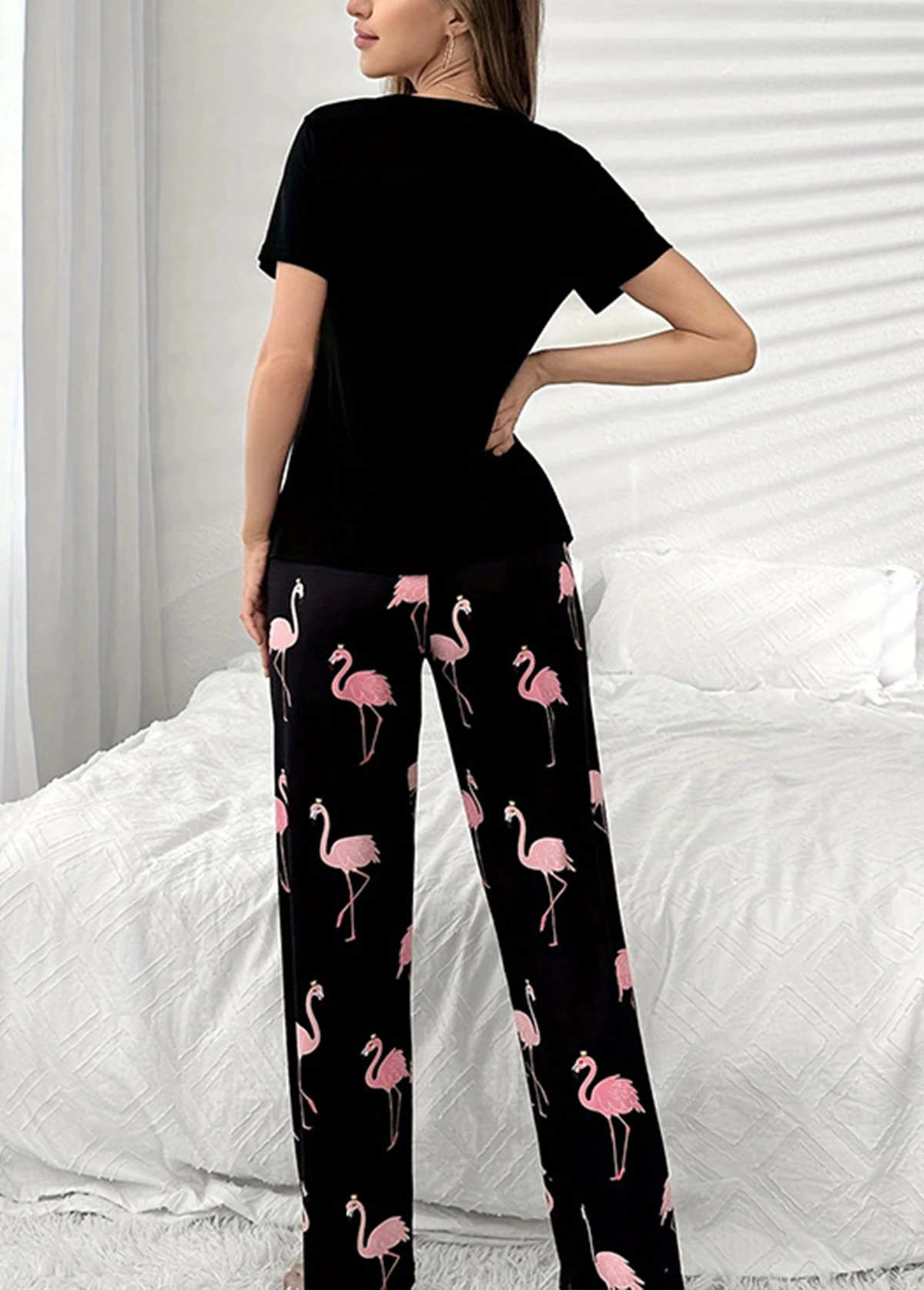 Home > Loungewear > Loungewear Sets/ Black Round Neck Short Sleeve Lounge Top and Pants