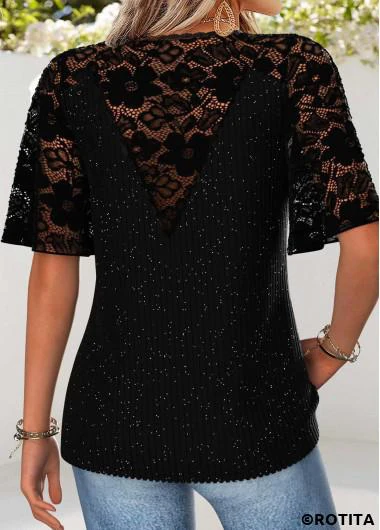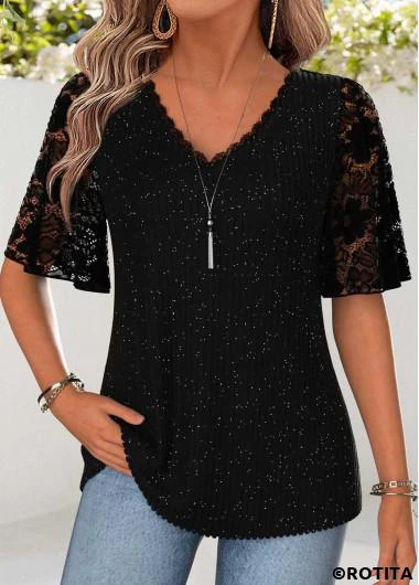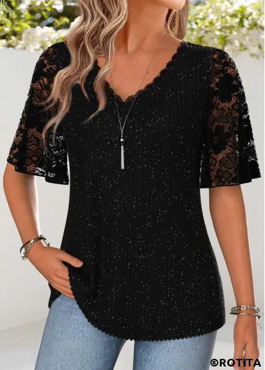 Home > Tops > Tees&T-shirts/ ROTITA Curved Hem Black V Neck Half Sleeve T Shirt
