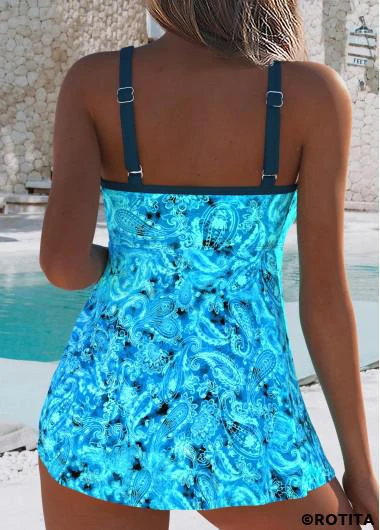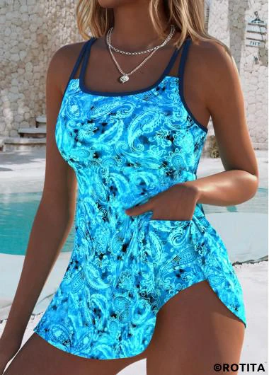 Home > Swimwear > One Piece Swimwear/ ROTITA Cyan Fake 2in1 Paisley Print One Piece Swimdress