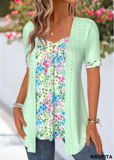 Function:Tummy Coverage Package Contents:1 X Fake Two Piece Twinset Color:Green Printing Design:Ditsy Floral, Print Placement Will Vary Clothing Length:Tunic Sleeve's Length:Short Sleeve Neckline:Heart Collar Sleeve Style:Regular Sleeve Placket Style:Pull On/Pullover Style:Casual Occasion:Everyday Composition:95% Polyester 5% Spandex Washing Instructions:Hand Wash/Machine Wash Selling Point:Hollowedout/Lace/Openwork,Button,Shirred,Curved hem,Fake 2in1