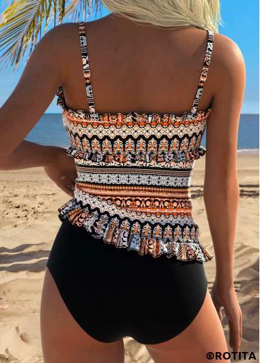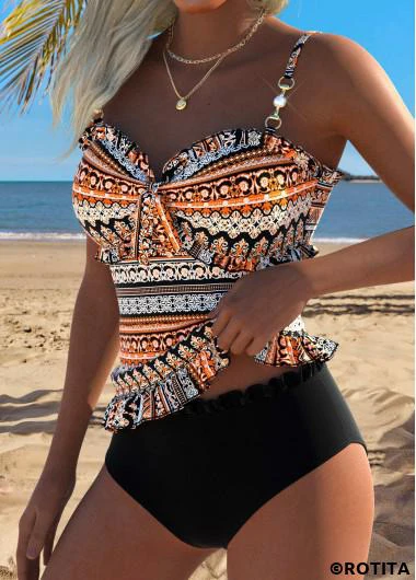 Home > Swimwear > Tankinis > Tankini Sets/ ROTITA Orange Frill Tribal Print Mid Waisted Tankini Set