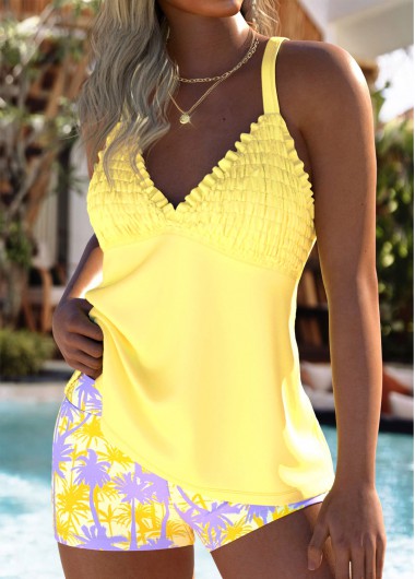 Home > Swimwear > Tankinis > Tankini Sets/ ROTITA Tummy Coverage Yellow Plants Print Mid Waisted Tankini Set
