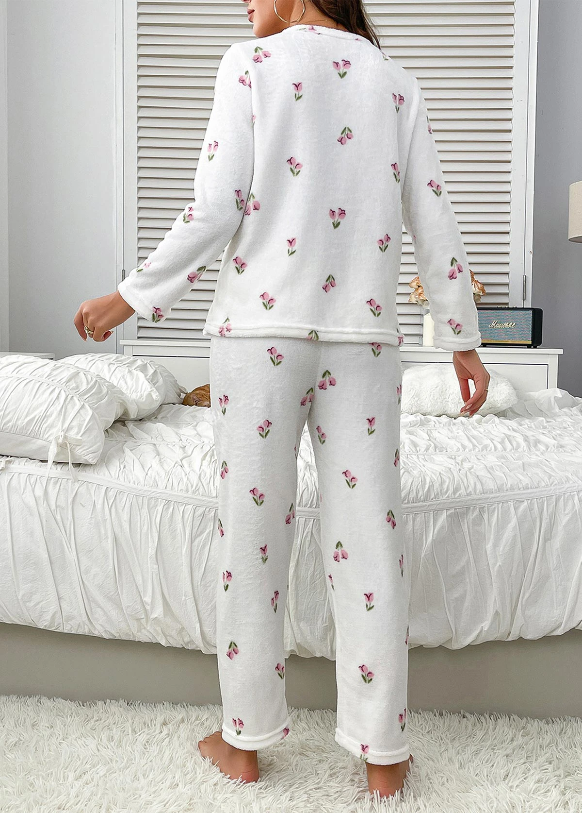 Home > Loungewear > Loungewear Sets/ Floral Print White Round Neck Lounge Top and Pants
