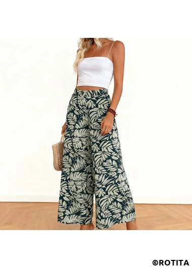 Home > Bottoms > Pants/ Flowy Leaf Print Turquoise Wide Leg Zipper Fly Pants