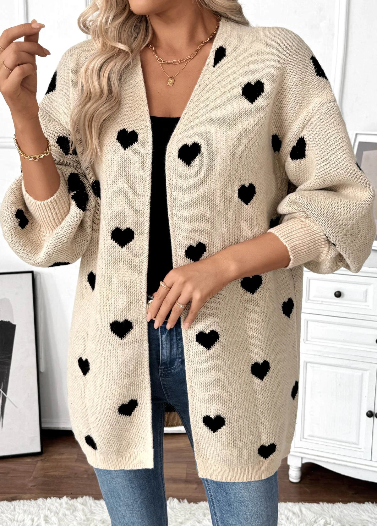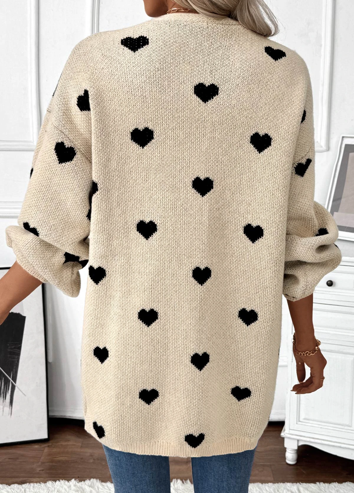 Heim > Oberteile > Strickjacken/ Bauchbedeckender hellkamelfarbener Langarm-Cardigan mit Herzmuster