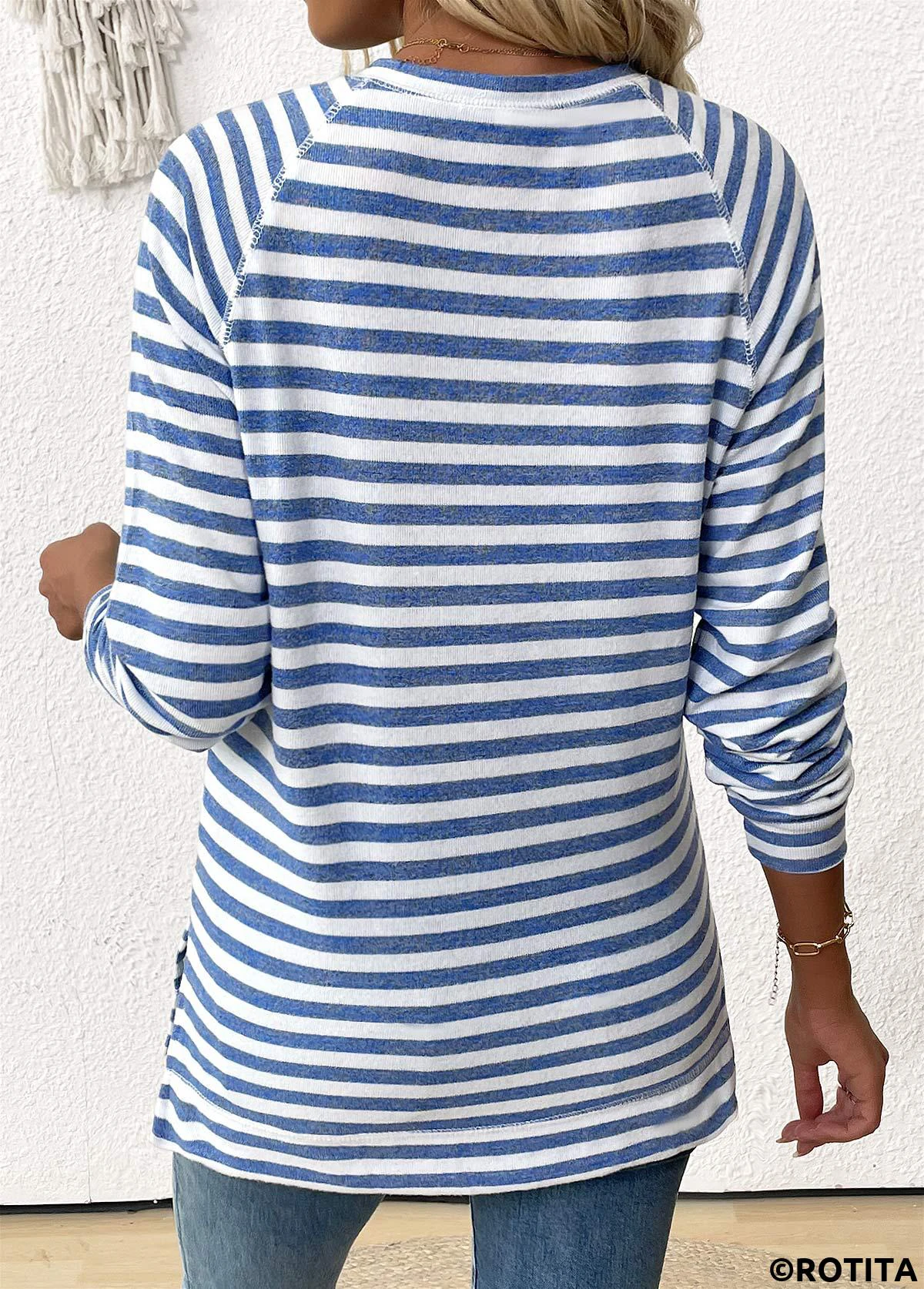 Rotita – gestreiftes hellblaues T-Shirt mit Rundhalsausschnitt und langen Ärmeln