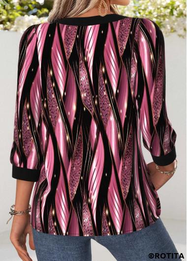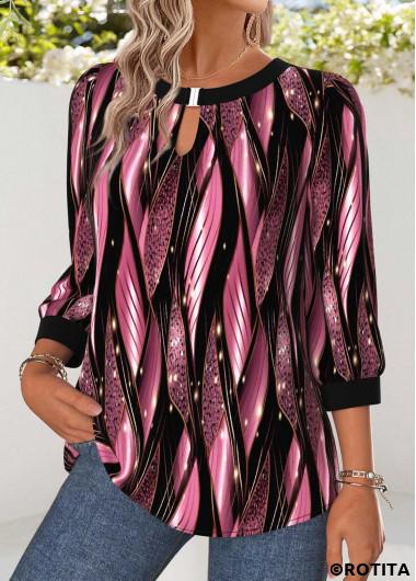 Heim > Oberteile > Blusen/ Rotita-Bluse mit Bauchbedeckung geometrischem Muster und rosa Rundhalsausschnitt