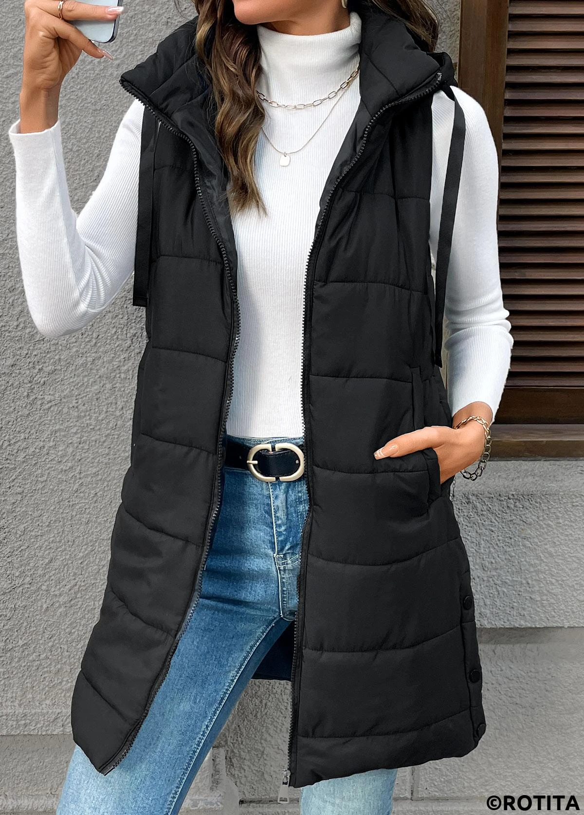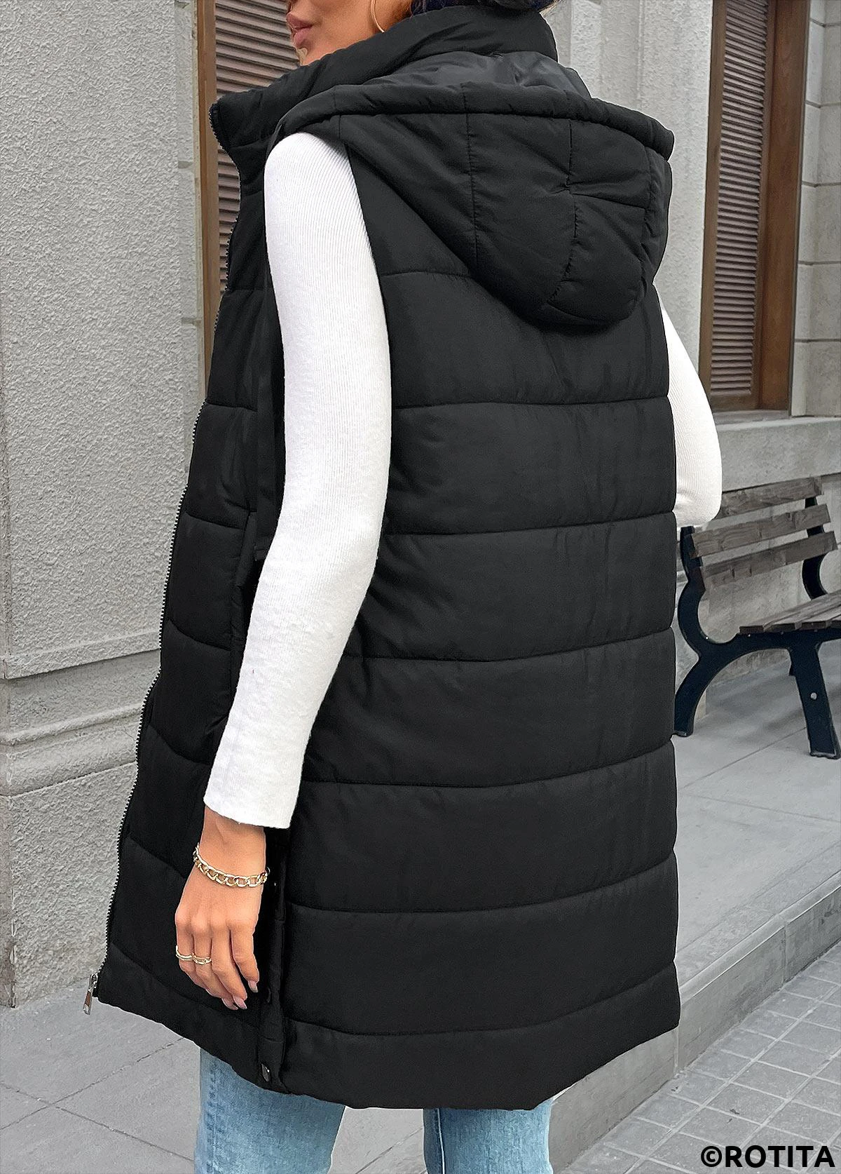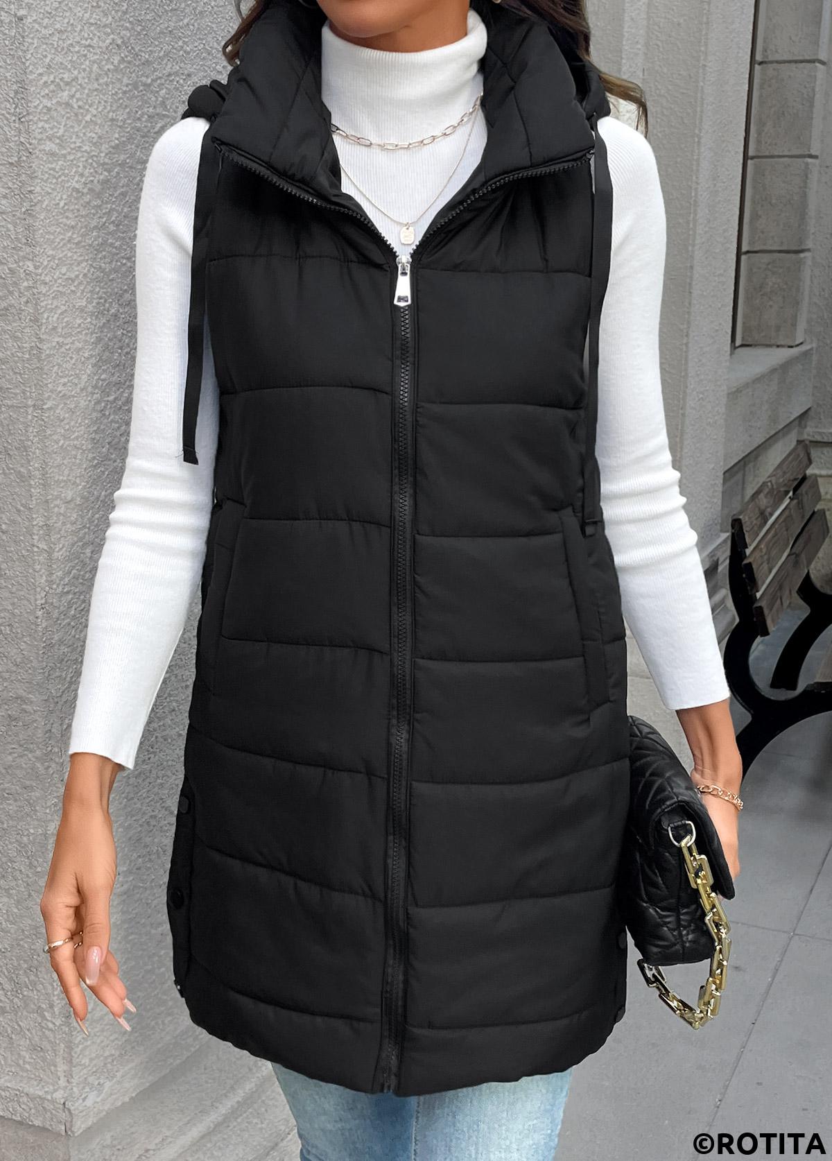 Heim > Oberteile > Westen & Westen/ Bauchbedeckende schwarze ärmellose Tunika-Weste