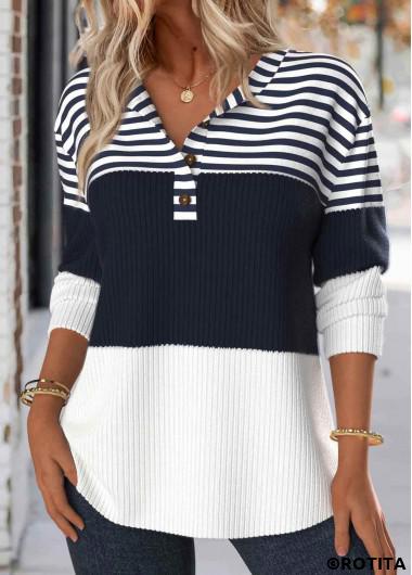 Maison > Grande taille > Hauts grande taille/ sweat-shirt à col fendu rayé bleu marine à boutons taille plus rotita