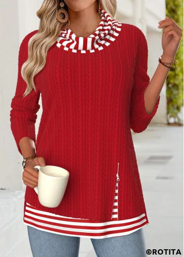 Nouvelle dans Sweat-shirt à manches longues et col bénitier à rayures rouges couvrant le ventre Rotita