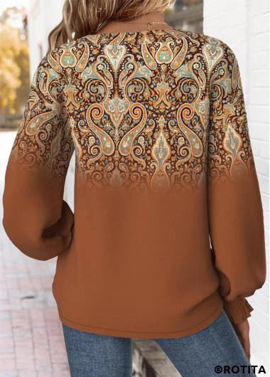 Nouvelle dans Sweat-shirt Rotita à ourlet arrondi imprimé tribal col en V couleur café foncé