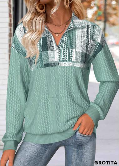Sweat-shirt à manches longues vert sauge à imprimé géométrique couvrant le ventre Rotita